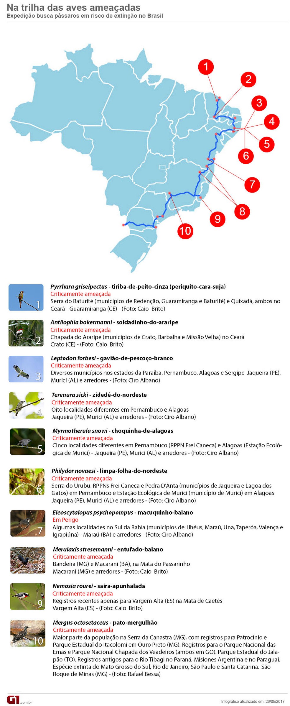 Cruzar o Brasil de ponta a ponta em busca de aves ameaçadas de extinção. Com essa missão, os biólogos Caio Brito e Tatiana Pongiluppi vão percorrer, de motocicleta, mais de 5.000 quilômetros entre Fortaleza, no Ceará, e a cidade de Puerto Iguazu, no Paraguai, em busca de 10 espécies em risco de extinção. (veja imagens dos pássaros abaixo)